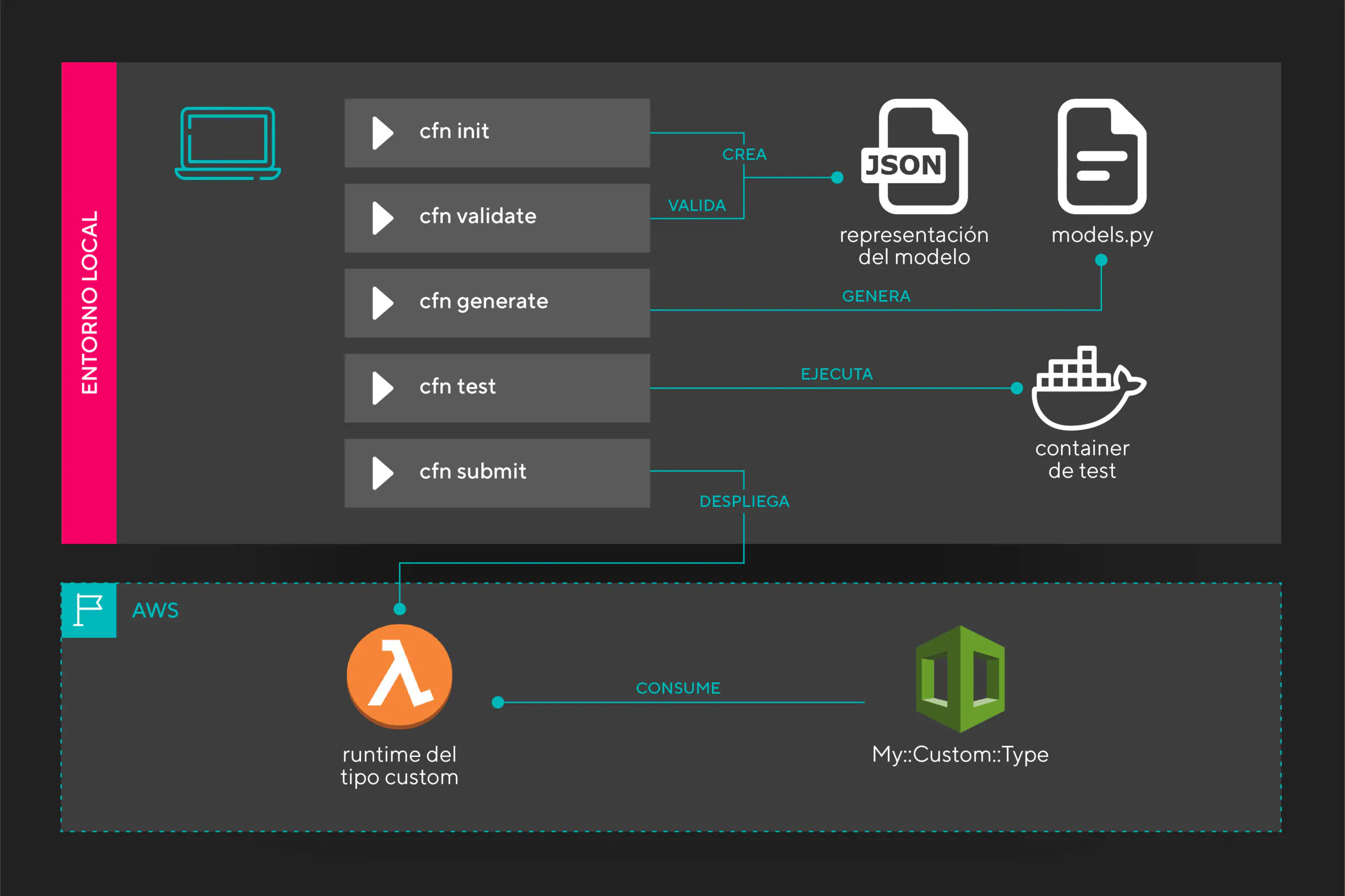 • Resource types: son elementos que se pueden utilizar en la sección “Resources” de cualquier Template de CloudFormation. Se utilizan de la misma forma que aquellos descritos en la referencia oficial de CloudFormation (como, por ejemplo, AWS::ApiGatewayV2::Api). En este blogpost nos vamos a concentrar particularmente en esta familia de extensiones.