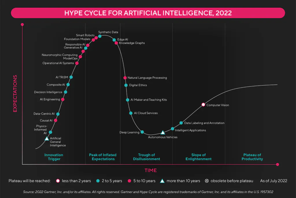 Hoy, la inteligencia artificial se encuentra en el pico de las expectativas según la consultora Gartner. Toda tecnología atraviesa este mismo ciclo y solo algunas logran superarlo y llegar a convertirse en un estándar.