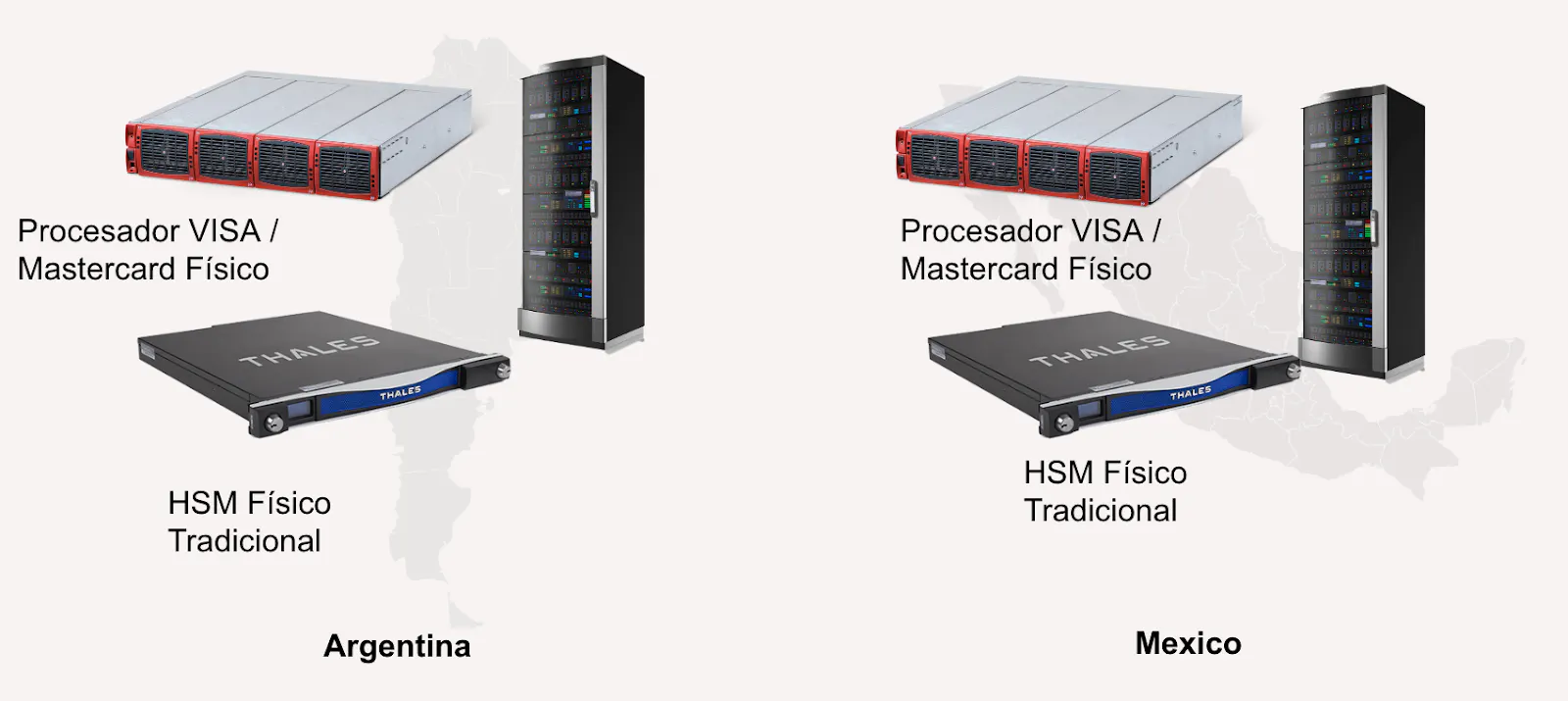 Imaginemos que somos una institución financiera y queremos procesar en varios países al mismo tiempo, en un modelo tradicional en cada país tendremos nuestra serie de centro de datos (DC) como se mencionó anteriormente y en cada uno tendremos nuestros servidores, conectores con VISA/Mastercard/otros y dispositivos de seguridad.