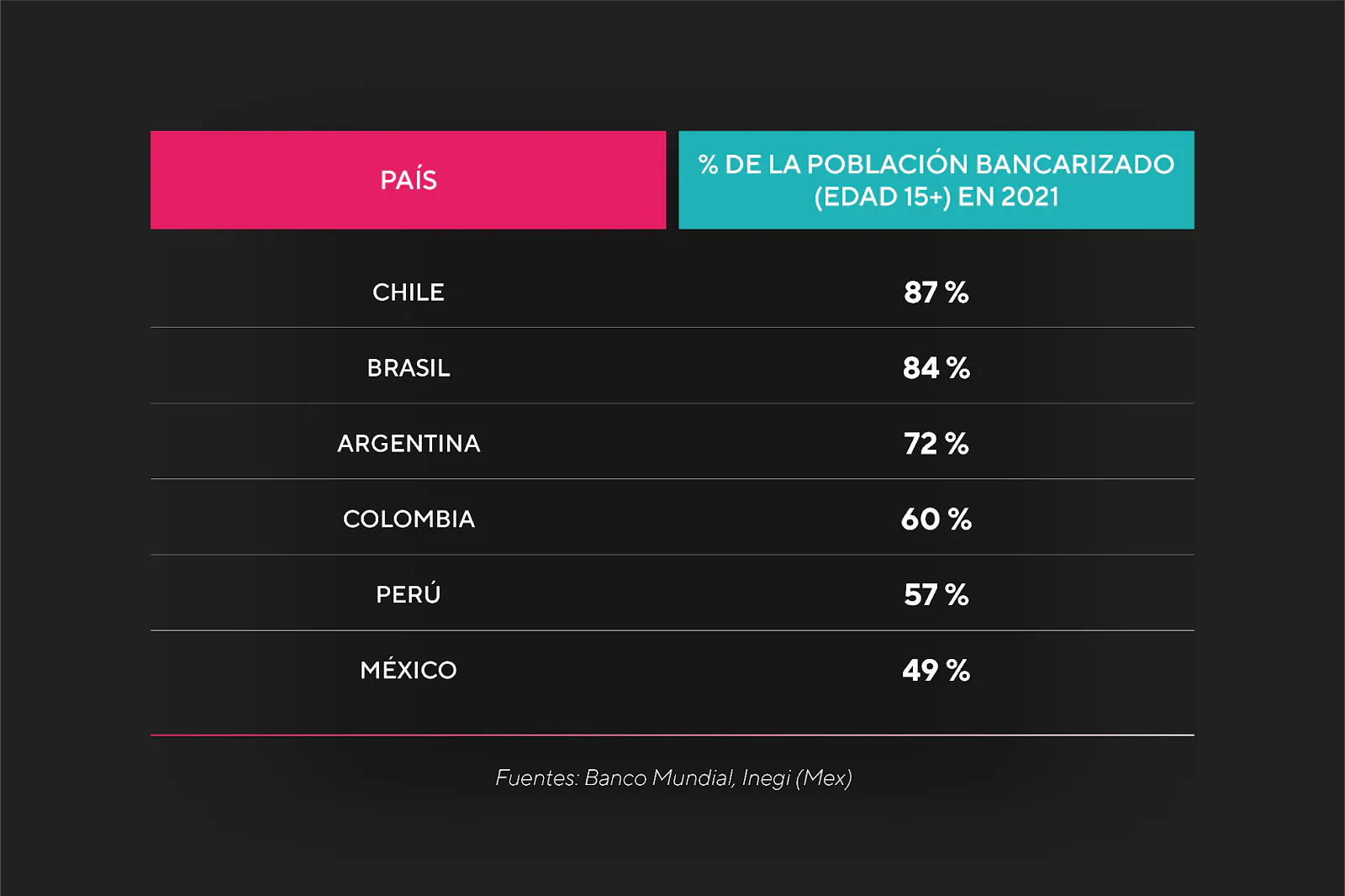 🇲🇽 En México, por otro lado, el Instituto Nacional de Estadística y Geografía reveló en un estudio que solo el 49,1 % del total de adultos de 18 a 70 años posee una cuenta bancaria. Esto es menos de la mitad de la población y lo coloca dentro de los últimos lugares dentro de la inclusión financiera de la región. Esto se debe a que el uso del efectivo está culturalmente instalado. Además, todavía no poseen la regulación gubernamental adecuada para el desembarco y crecimiento de los servicios financieros en el país, conocela aquí.