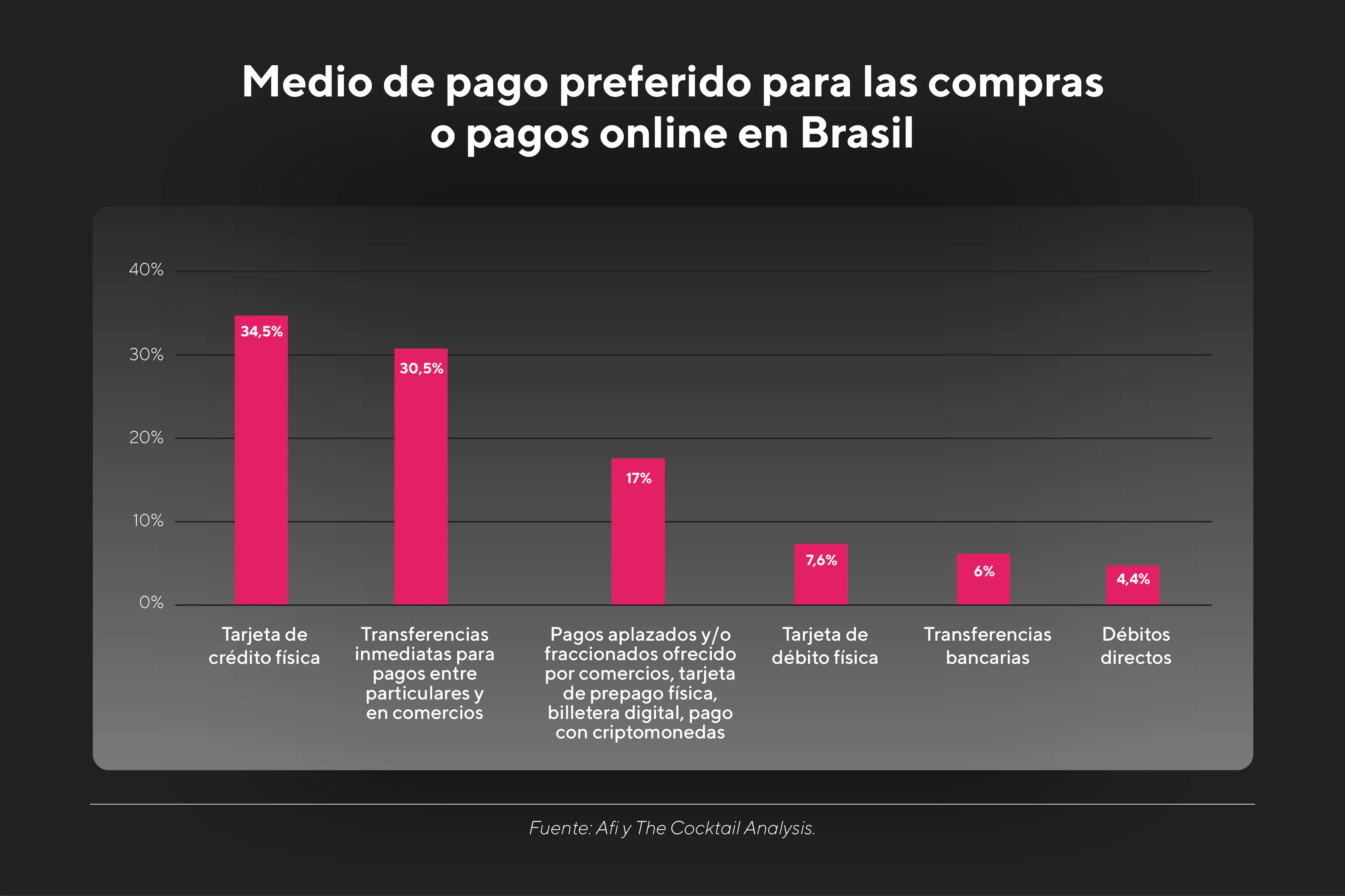El despegue de las fintech apalancado por grandes innovaciones tecnológicas, sumado a la pandemia del COVID-19, que llevó a las personas a adoptar soluciones bancarias digitales, resultó en un gran avance en la bancarización en la región. Este fenómeno se tradujo en una reducción significativa del uso del efectivo como medio de pago preferido: según AMI (Americas Market Intelligence)AMI (Americas Market Intelligence), actualmente el 44% de todo el universo de pagos en Latam se realiza con tarjetas, incluyendo ecommerce y retail, convirtiéndose así en el medio más utilizado. Esto significa que los pagos realizados en efectivo fueron superados, quedando en segundo lugar con un 36%.