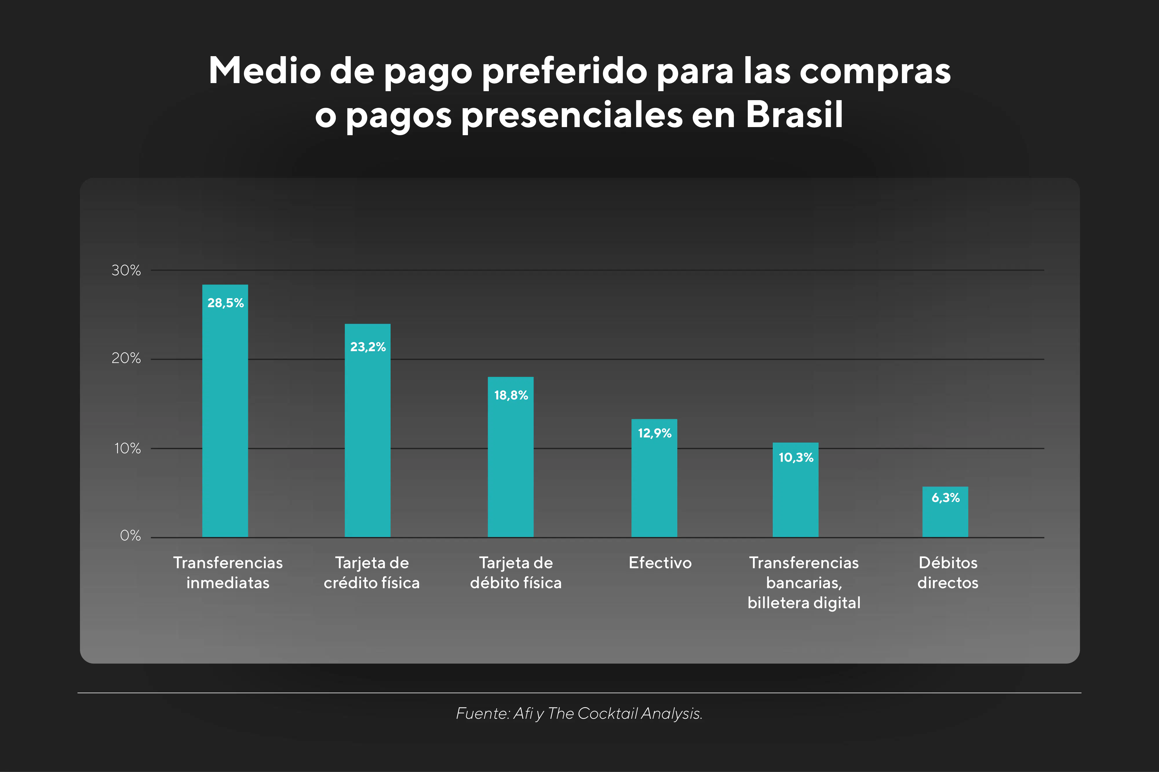 El fenómeno de Pix marcó también el camino del efectivo, el cual mantiene un lugar importante en la economía, pero inferior en comparación a otros países de la región. Se estima que la elección del efectivo para compras presenciales es solo del 12,9%, cifra superada ampliamente por el 28,5% de las transferencias inmediatas realizadas con Pix. Esto mismo se repite en las compras digitales: las transferencias superan el 30%, mientras que el efectivo desciende a un 6% del total.