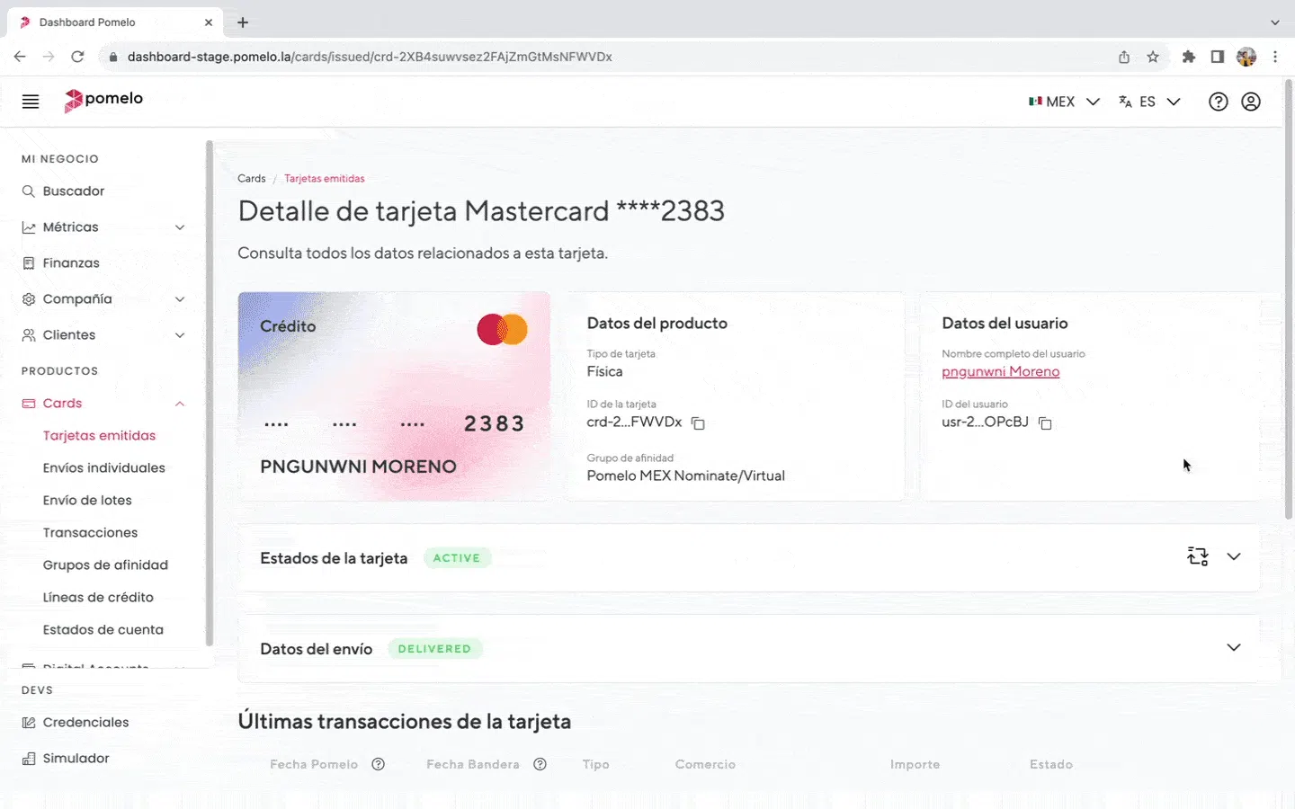 En la sección Tarjetas emitidas del Dashboard, cada tarjeta ahora cuenta con toda la información necesaria que le corresponde, en una vista única – que comprende, además, el estado detallado de su envío. La información clave incluye el estado de tarjeta, el envío con su status_detail, las transacciones, el usuario, el producto, y, en breve, la línea y el estado de cuenta. El nuevo detalle permite también linkear la navegación de todas las secciones que estén vinculadas a esa tarjeta.
