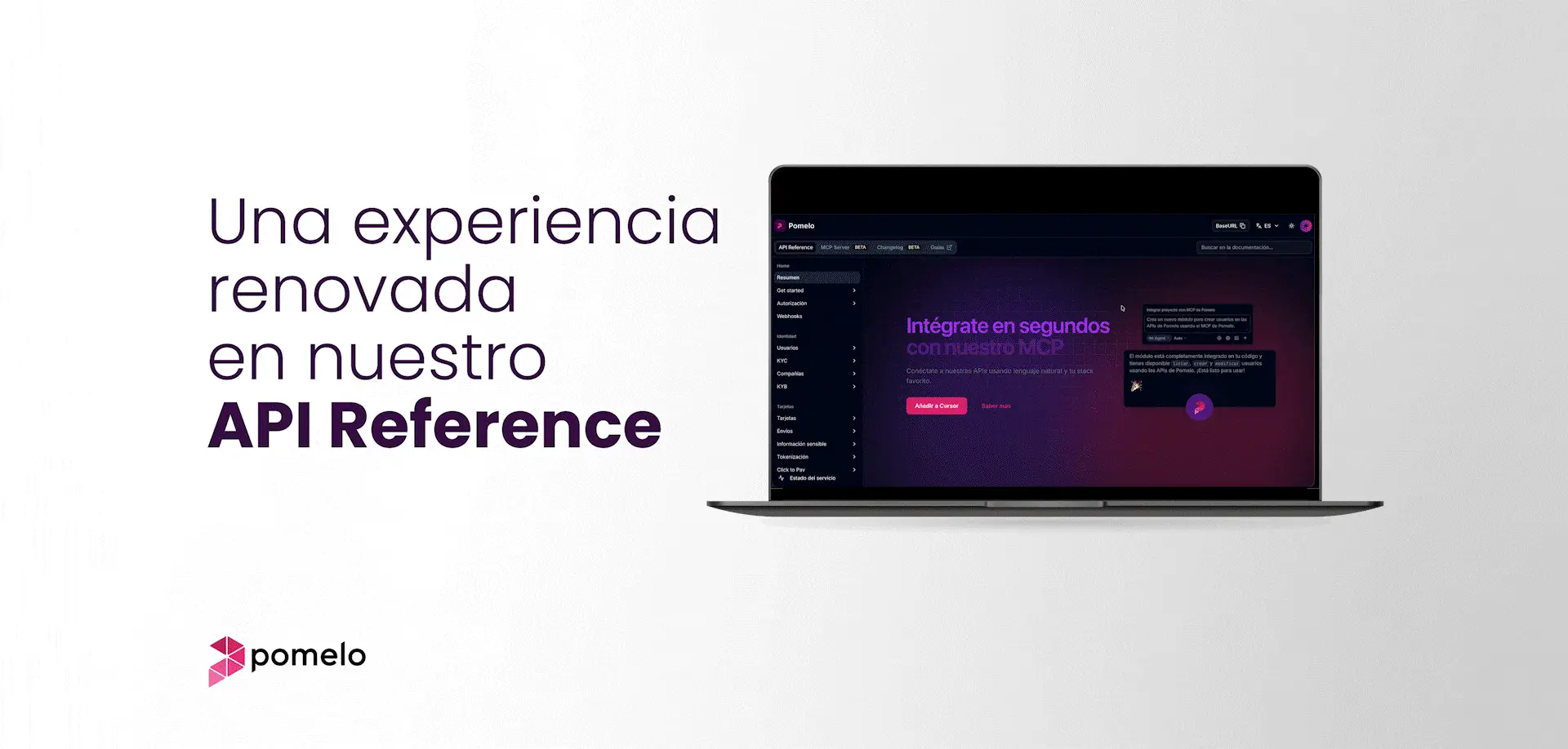 La nueva API Reference de Pomelo es un portal de documentación técnica rediseñado para facilitar la integración de nuestras APIs mediante buscador global, asistente técnico con IA y soporte para MCP Server. Este lanzamiento no es solo una actualización visual. Es un salto de calidad que acompaña nuestra expansión regional y la evolución de nuestro ecosistema de productos. Conoce todo lo que incorporamos a nuestro API Reference a continuación: