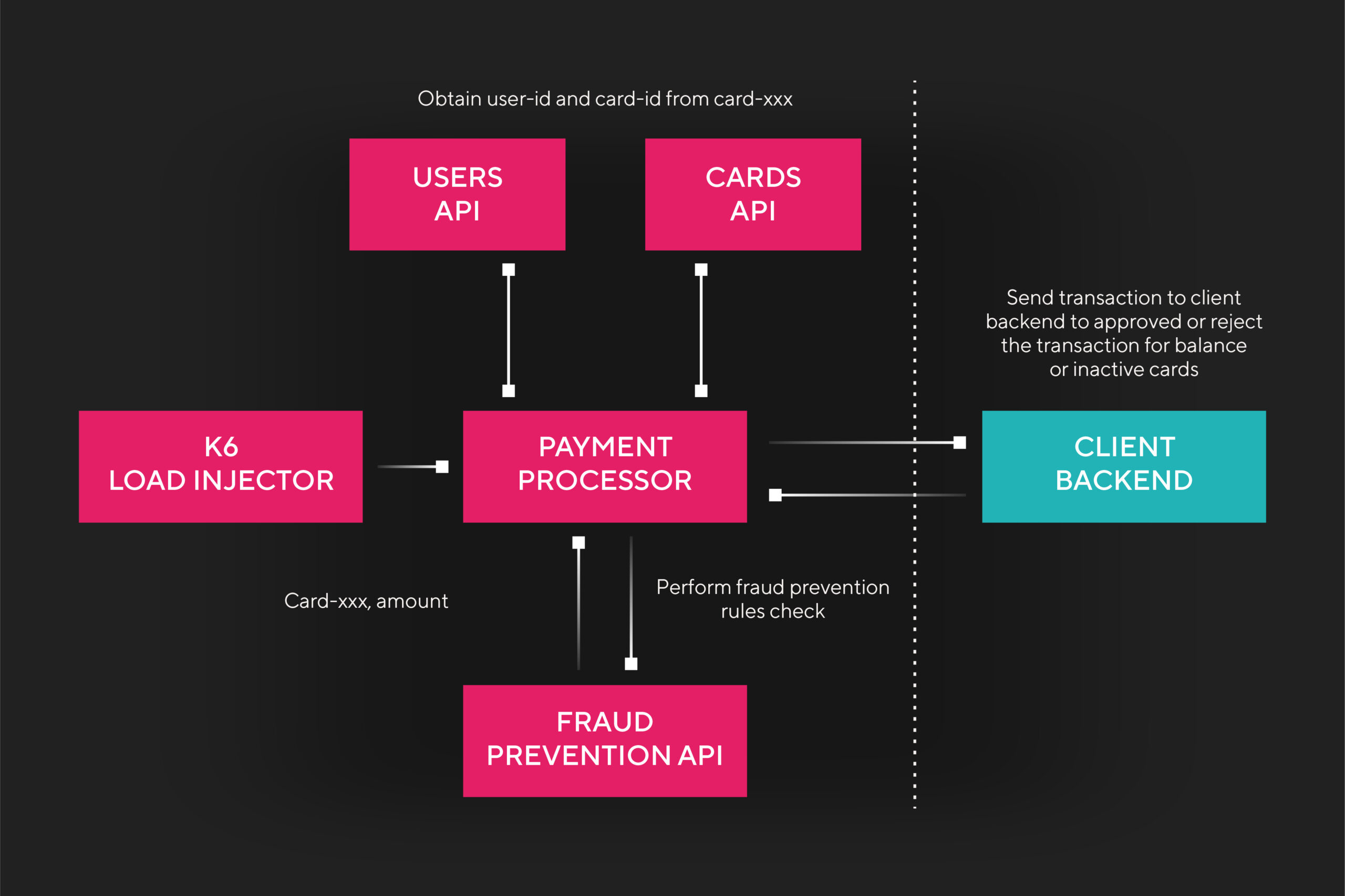 ¡Ahora, vayamos a la prueba en sí! Primero tuvimos que simular las pruebas que iba a realizar nuestro cliente de creación de usuarios y tarjetas. Dentro de nuestra plataforma, tenemos automatizado un flujo de dos pasos donde primero creamos usuarios, y segundo, generamos una nueva tarjeta virtual asignada a ese usuario. Todo esto sucede en 1 segundo, máximo 2, y con alta carga concurrente.