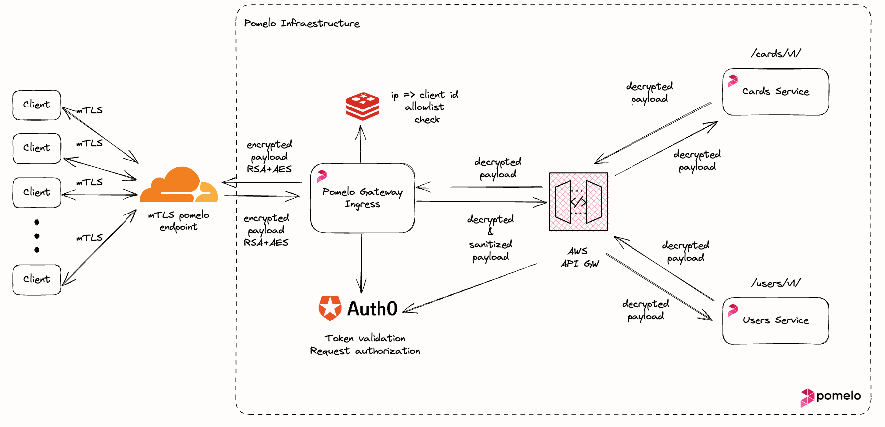 En el flujo anterior podemos ver varios de los actores involucrados, el primero es nuestro Pomelo Gateway, el cual nos brinda la habilidad de mutual TLS, con certificado intercambio con el cliente, encriptación del cuerpo del mensaje, listas de allowlist /blocklist según cliente y validación de tokens de auth0. Es muy importante porque nos da una segunda barrera en nuestra seguridad que tiene un diseño de cebolla. Capa exterior Cloudflare, luego Pomelo Gateway y luego los propios scopes de las aplicaciones. Vale aclarar que todo el tráfico end 2 end de Pomelo es encriptado mTLS.