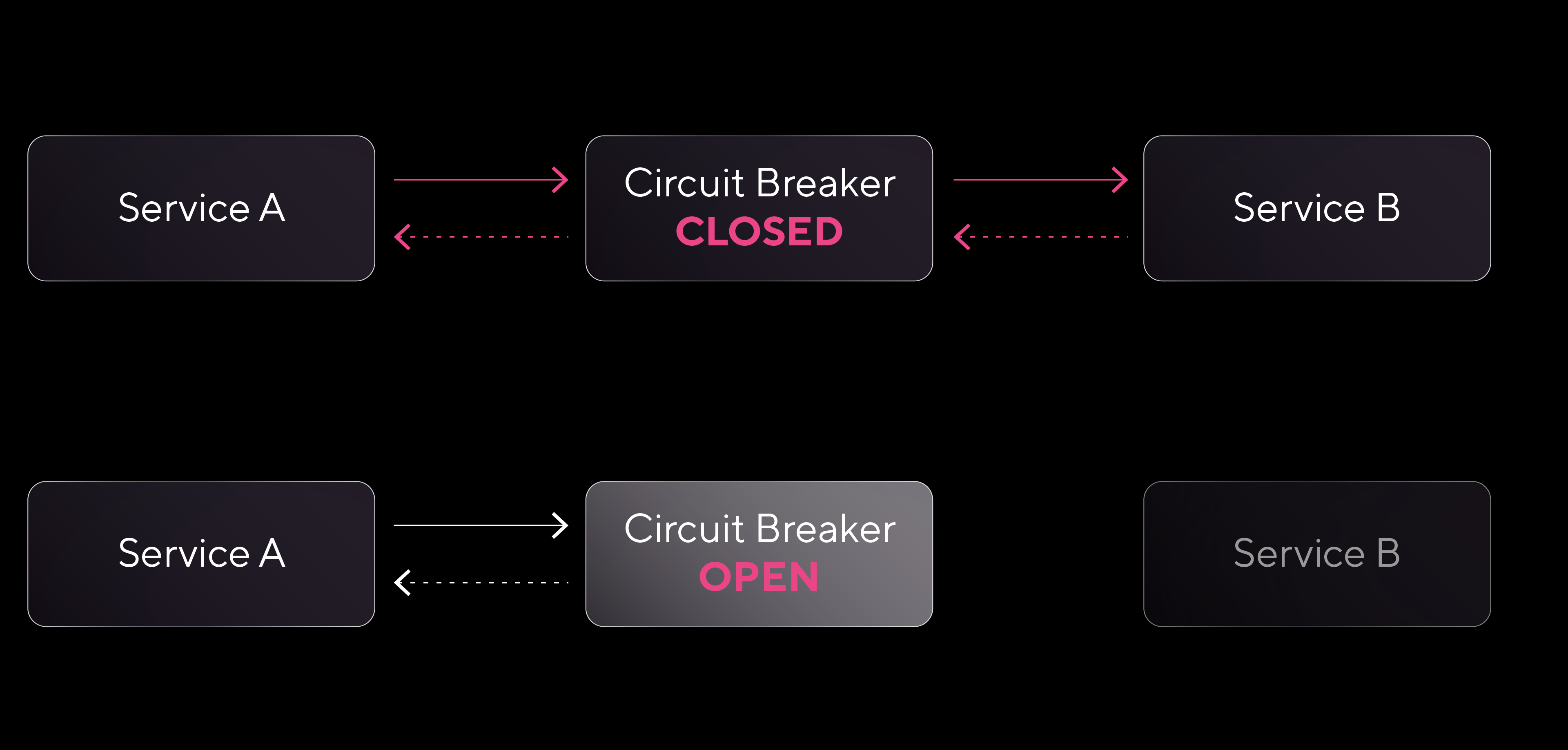 El Circuit Breaker es un mecanismo de protección pensado para bloquear las llamadas a un servicio cuando se detecta una cantidad consecutiva de errores, evitando así que las fallas se propaguen en cadena. En condiciones normales, el circuito está en estado cerrado, permitiendo que las solicitudes se procesen sin restricciones. Sin embargo, cuando un servicio empieza a fallar y el número de errores llega a un límite preconfigurado, el circuito pasa al estado abierto. En este estado, se bloquean las solicitudes hacia el servicio que falla y se devuelven errores de inmediato, evitando que el sistema siga intentando conexiones que probablemente van a fallar, lo que ahorra recursos.