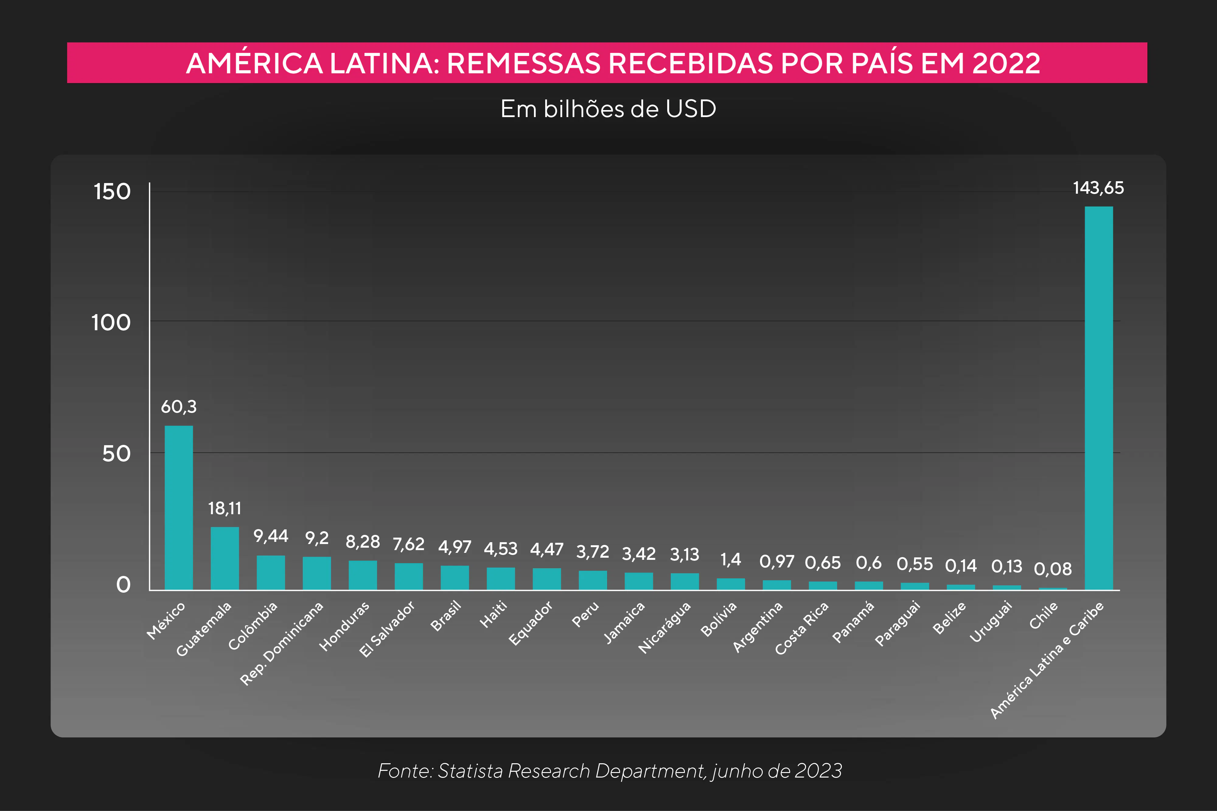 De acordo com o Banco Mundial, a América Latina é a segunda maior região receptora de remessas do mundo, tendo registrado entradas de USD 142 bilhões em 2022 – um aumento de 9,3% em relação ao ano anterior. O número é superado apenas pelo sul da Ásia, que recebeu mais de US$ 163 bilhões no mesmo ano. Este crescimento das remessas na América Latina foi influenciado pelo aumento do emprego de migrantes latinos nos Estados Unidos, além da recuperação econômica pós-pandemia.