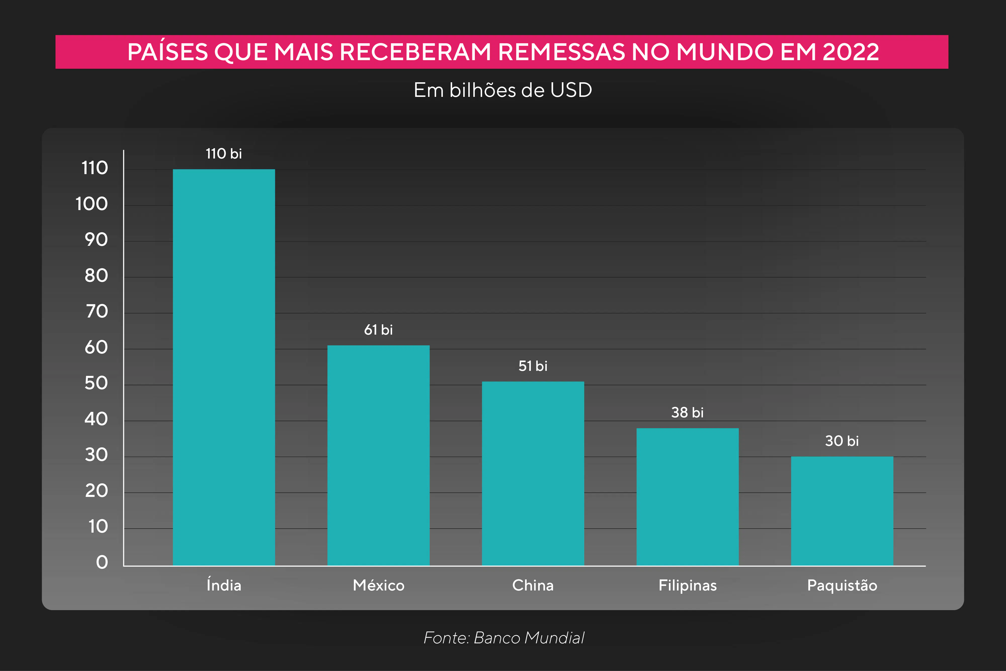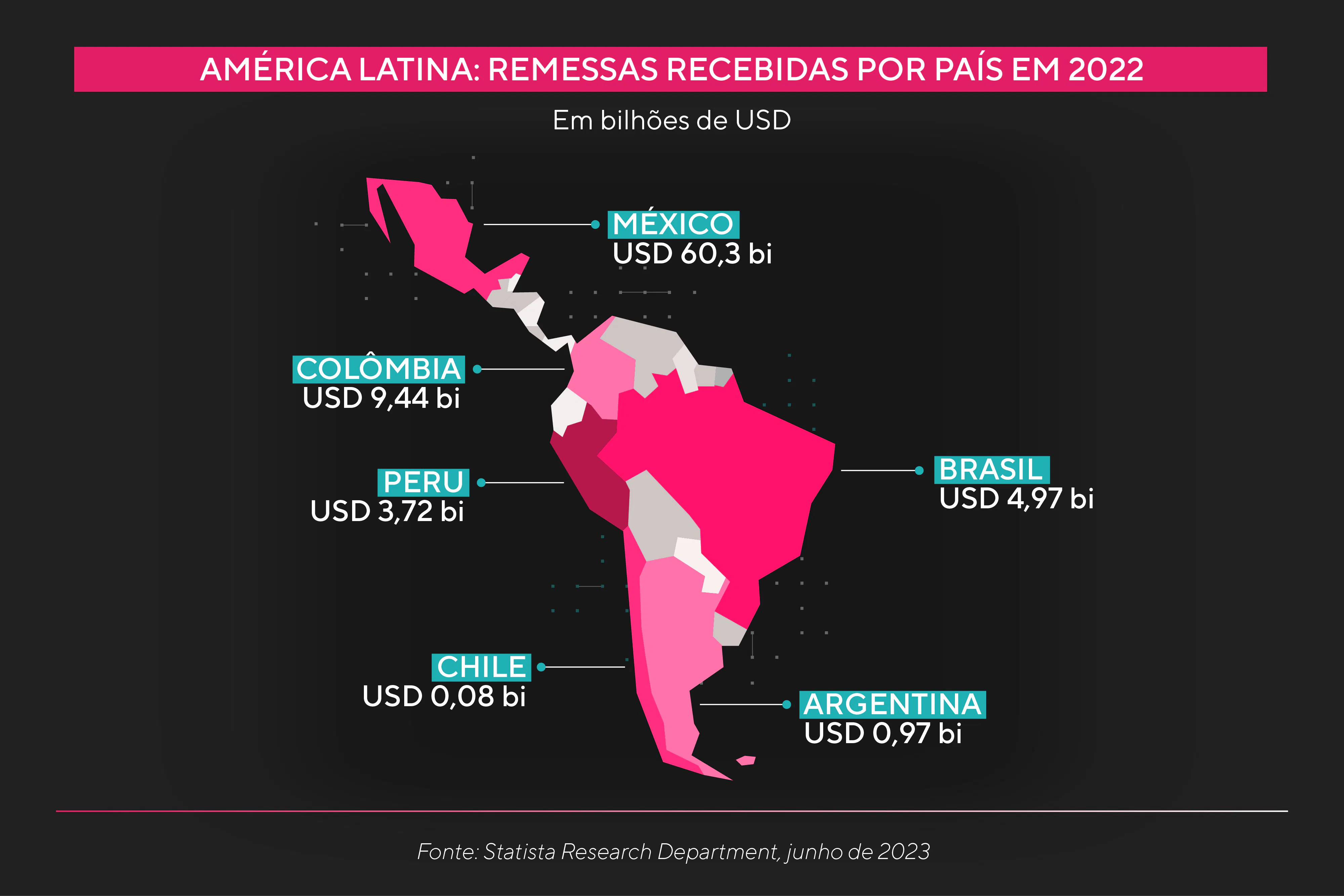 Como um caso marcante na região, é o México quem se destaca: é o segundo país que mais recebeu remessas em todo o mundo durante 2022! O país é seguido pela Guatemala e pela Colômbia.