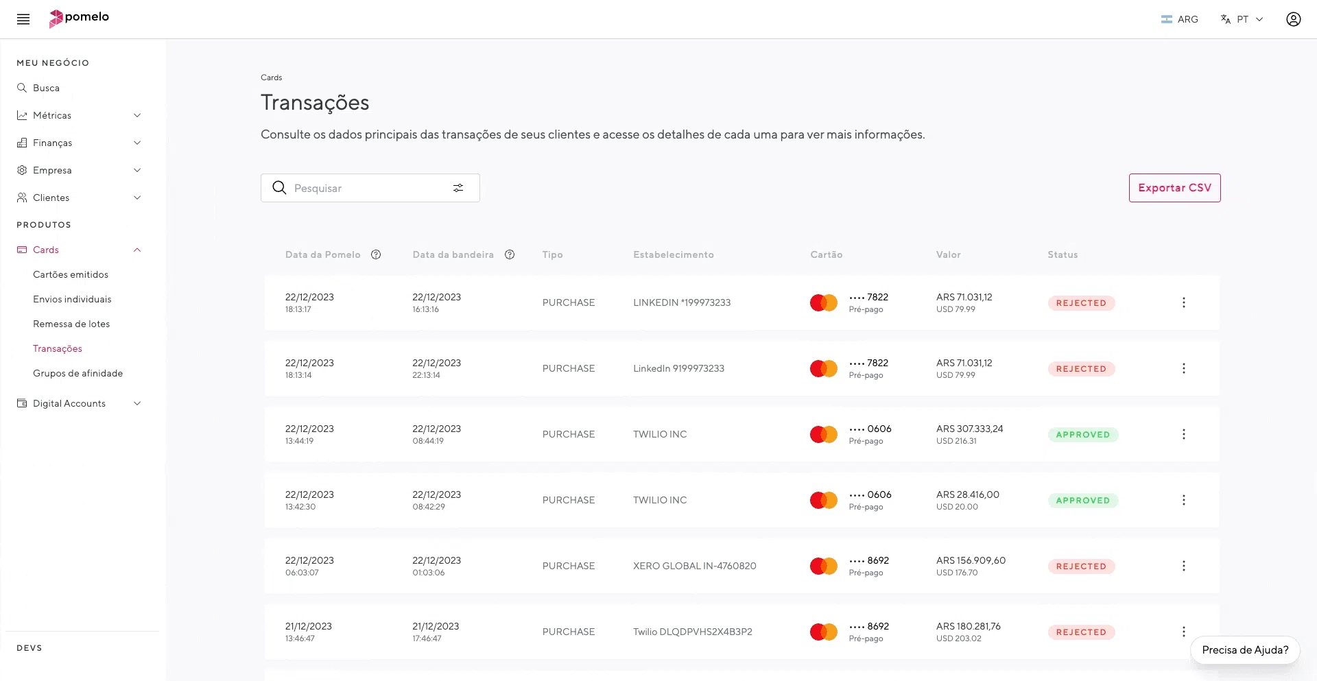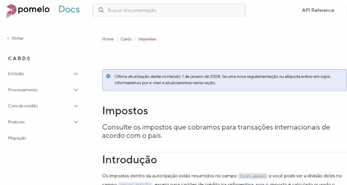 Agora, os clientes podem consultar detalhadamente os impostos que se aplicam às compras internacionais de seus usuários com cartões fornecidos pela Pomelo. A nova documentação fiscaldocumentação fiscal permite consultar os impostos transacionais que se aplicam à Argentina e ao Brasil.