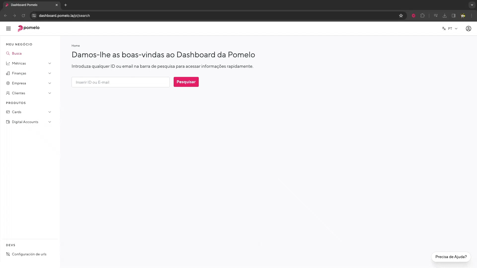 O cliente seleciona o botão de ajuda e vai em Preciso entrar em contato com a Pomelo;