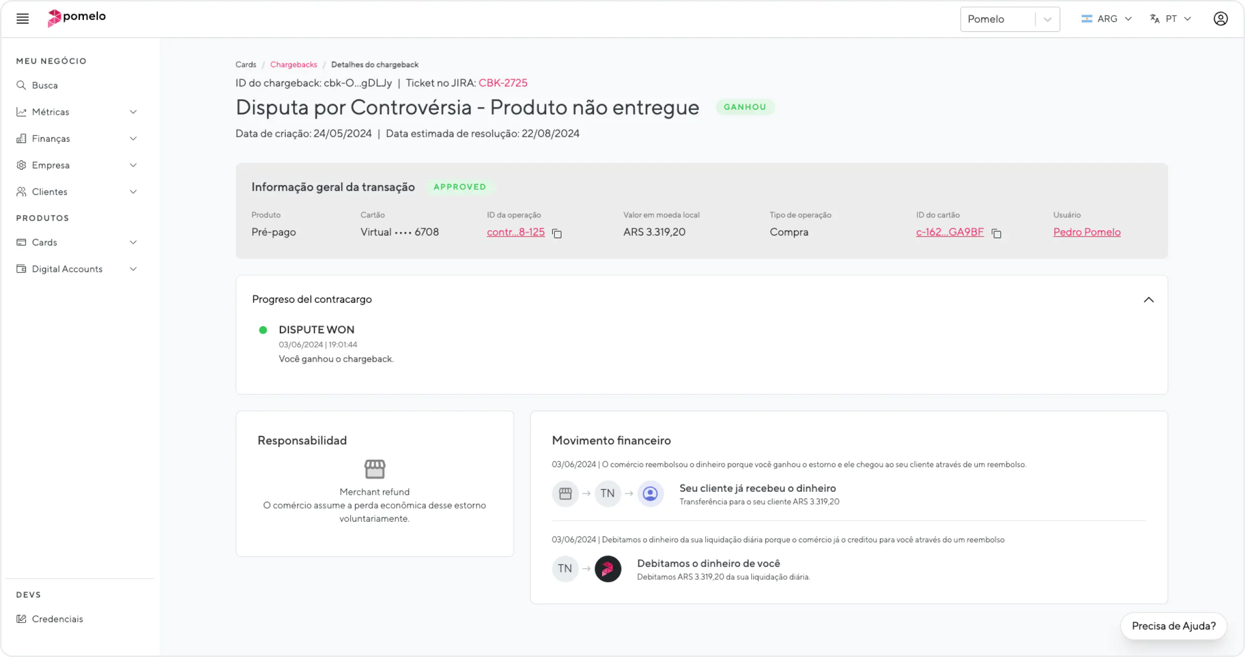 Lançamos um novo webhook para enviar notificações de qualquer alteração de status de estorno ou substatus de status para nossos clientes por meio do Dashboard. Agora, nossos clientes receberão atualizações sempre que o status de suas disputas for alterado.