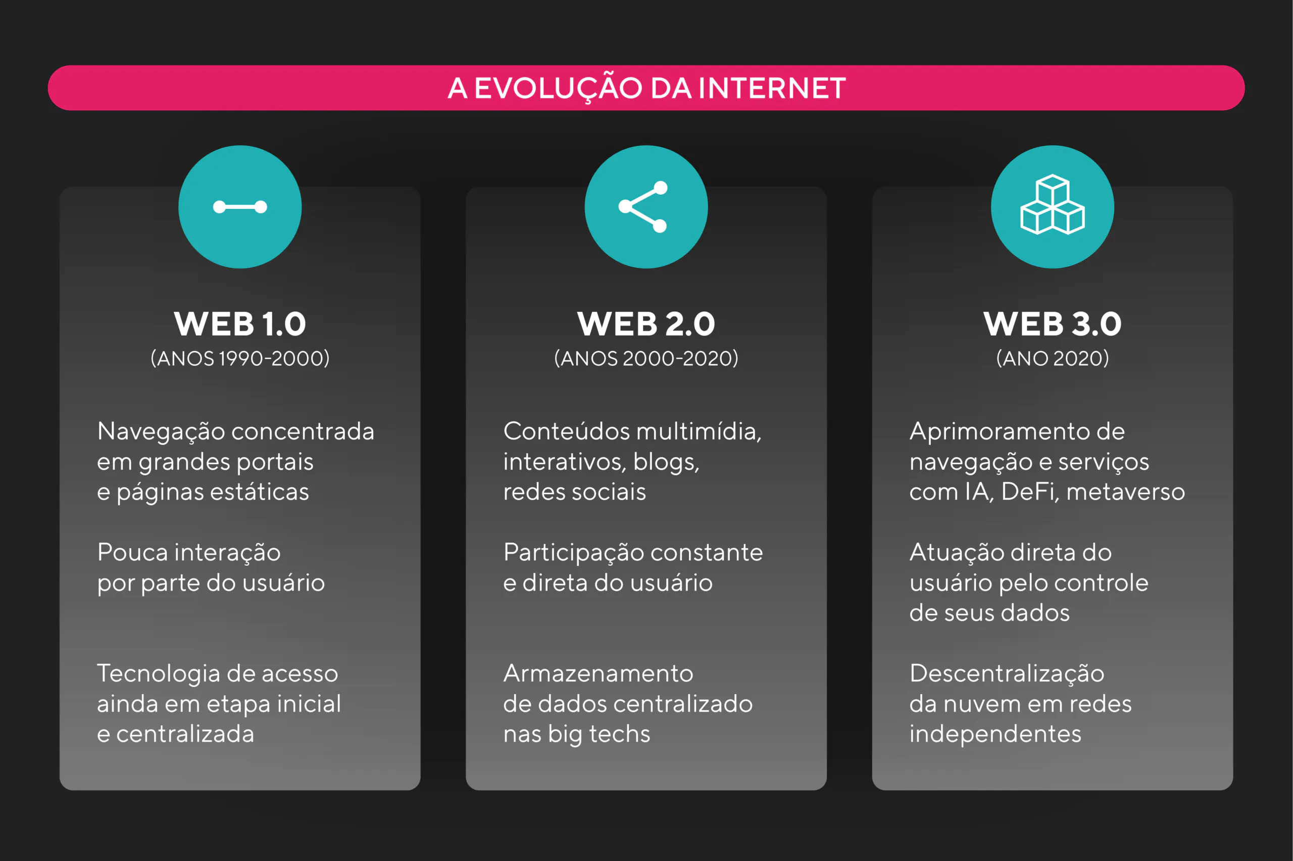Ela surge como alternativa ao modelo atual (apelidado de Web2 ou Web 2.0), em que as informações que consumimos e produzimos é centralizada em servidores tecnológicoscentralizada em servidores tecnológicos de empresas big tech. Para revolucionar a forma como os usuários fazem tudo online, ela funciona em cima de três pilares principaistrês pilares principais: