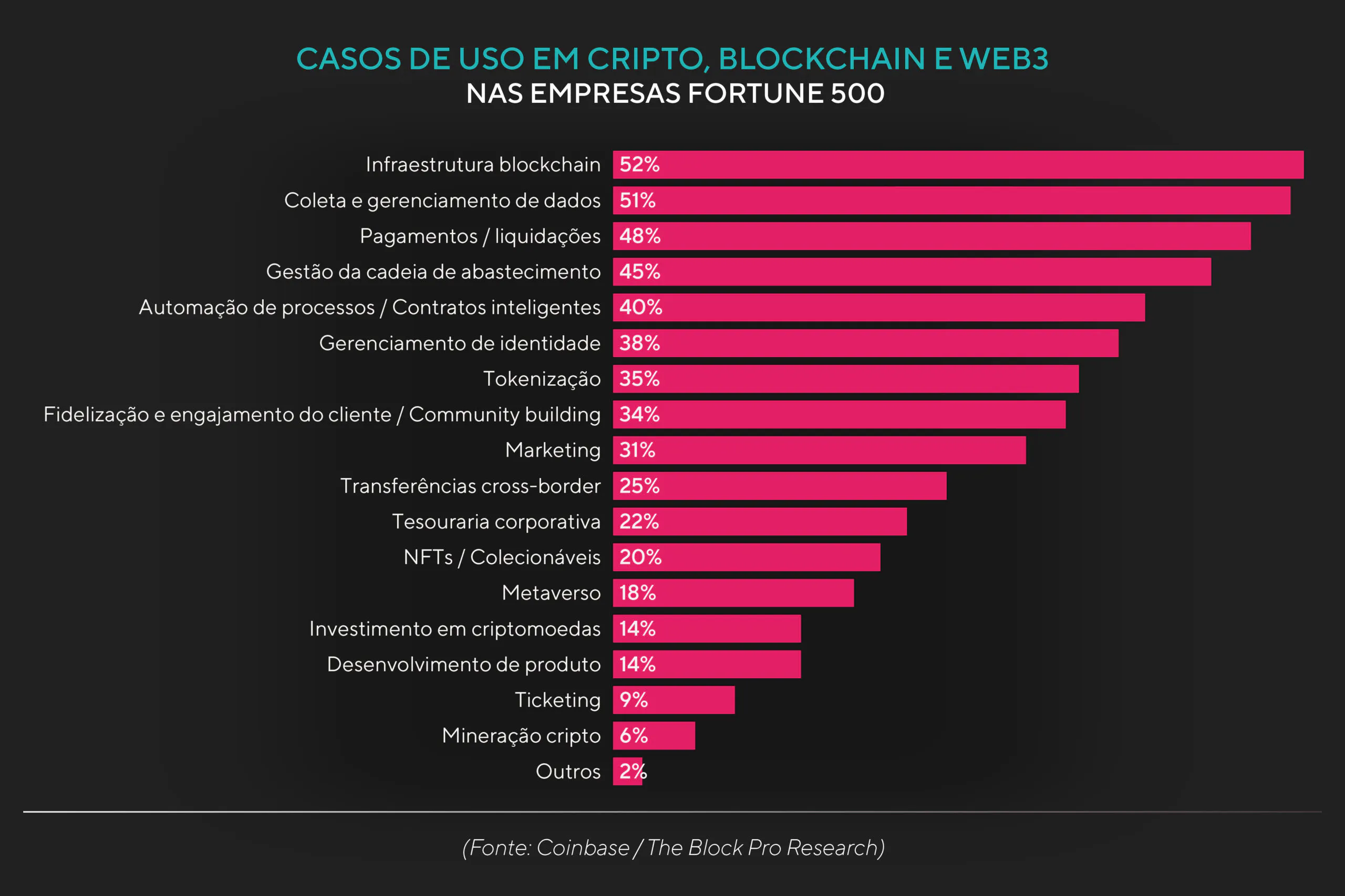 Hoje, grandes players de diferentes mercados não perdem tempo em explorar a Web3 como um ambiente novo de negócios. As principais bandeiras de cartões de crédito do mercado já exploram novas fontes de receitaAs principais bandeiras de cartões de crédito do mercado já exploram novas fontes de receita para seus negócios com criptos e stablecoins, além de gateways próprios de pagamento que facilitam a conexão entre seus sistemas de pagamento e a tecnologia blockchain. Além disso, a maioria das corporações das listas Fortune 100 e 500maioria das corporações das listas Fortune 100 e 500 já adota iniciativas com criptos e blockchain.